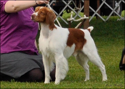 Oliver was shown lightly as he matured, picking up a 5 point major at just 10 months old, as well a few singles. He finished easily taking his second major at the CNEBC Specialty Show and his last few points two days later at the supported entry. At 19 1/2 inches he's a bit smaller than the majority of males we come across in the show ring, but despite this he is a multi-best of breed winner. Though not shown often anymore, he is fun and easy to work with and I always enjoy my time with him in the ring. What Oliver enjoys most however, is our time in the field. Whether in the ring, field or on the couch, Oliver exemplifies all the wonderful qualities in a Brittany.